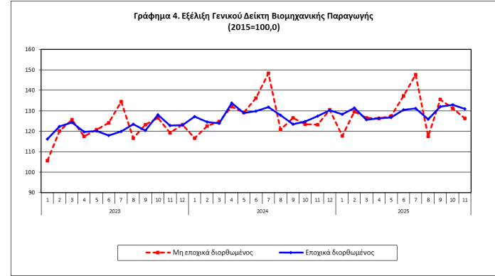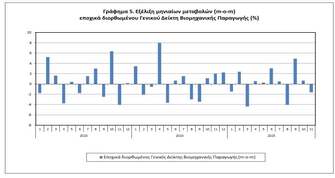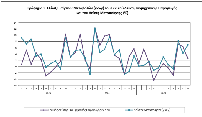 Σύμφωνα με την ΕΛΣΤΑΤ, ο γενικός δείκτης βιομηχανικής παραγωγής παρουσίασε αύξηση 2,6% τον Νοέμβριο 2025 σε σύγκριση με τον αντίστοιχο δείκτη του Νοεμβρίου 2024, έναντι αύξησης 3,3% που σημειώθηκε κατά την αντίστοιχη σύγκριση το 2024 με το 2023.