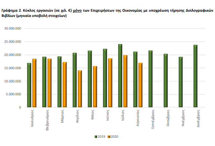 Για τις επιχειρήσεις που τέθηκαν σε αναστολή λειτουργίας με υποχρέωση τήρησης διπλογραφικών βιβλίων, ο κύκλος εργασιών τον Αύγουστο 2020 ανήλθε σε 1.494.673 χιλ. ευρώ, σημειώνοντας μείωση 36,8% σε σχέση με τον Αύγουστο 2019, που είχε ανέλθει σε 2.363.603 χιλ. ευρώ.