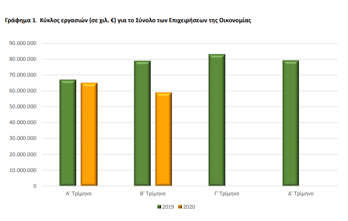 Σύμφωνα με την ΕΛΣΤΑΤ, για το σύνολο των επιχειρήσεων και των δραστηριοτήτων της οικονομίας, ο κύκλος εργασιών το β’ τρίμηνο του 2020 ανήλθε σε 58.987.931 χιλ. ευρώ σημειώνοντας μείωση 25,1% σε σχέση με το β’ τρίμηνο του 2019, οπότε είχε ανέλθει σε 78.800.256 χιλ. ευρώ.