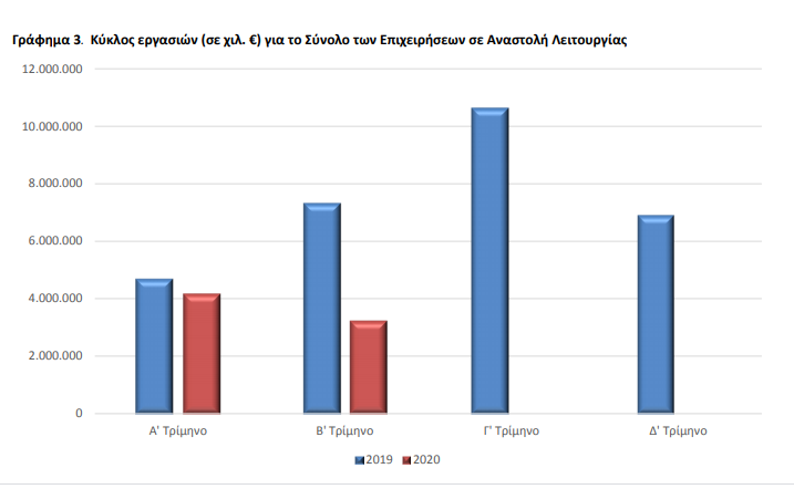 Για τις 205.984 επιχειρήσεις που τέθηκαν σε αναστολή λειτουργίας, ο κύκλος εργασιών το β’ του τρίμηνο 2020 ανήλθε σε 3.232.618 χιλ. ευρώ, σημειώνοντας μείωση 55,9% σε σχέση με το β’ τρίμηνο του 2019, όταν είχε ανέλθει σε 7.329.184 χιλ. ευρώ. Οι επιχειρήσεις του κλάδου των «Καταλυμάτων» και της «Παραγωγής κινηματογραφικών ταινιών, βίντεο και τηλεοπτικών προγραμμάτων, ηχογραφήσεων και μουσικών εκδόσεων» παρουσίασαν τη μεγαλύτερη μείωση κατά 94,7% και 88,4%, αντίστοιχα.