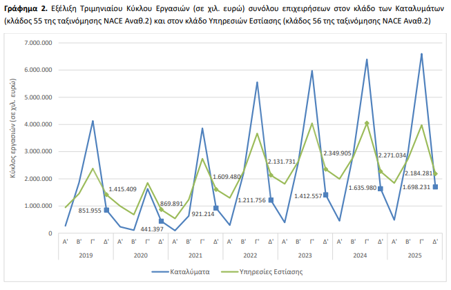 Αντίθετα, σύμφωνα επίσης με την ΕΛΣΤΑΤ, ο κύκλος εργασιών των επιχειρήσεων των υπηρεσιών εστίασης ανήλθε σε 10.734.747 χιλ. ευρώ, σημειώνοντας μείωση 3,4% σε σχέση με το 2024, όπου είχε ανέλθει σε 11.117.232 χιλ. ευρώ.