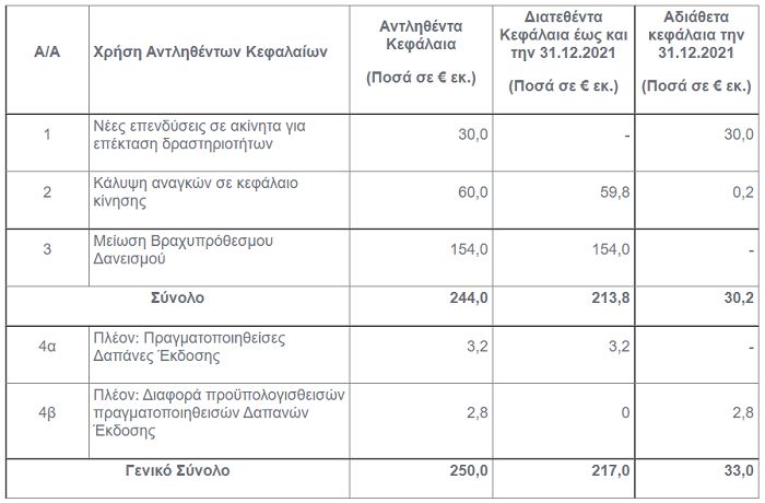 Σύμφωνα με τα όσα διατυπώνονται στο σχετικό Ενημερωτικό Δελτίο, γνωστοποιείται ότι μέρος των αντληθέντων κεφαλαίων διατέθηκε από τις 17.11.2021 μέχρι και τις 31.12.2021 ως ακολούθως: