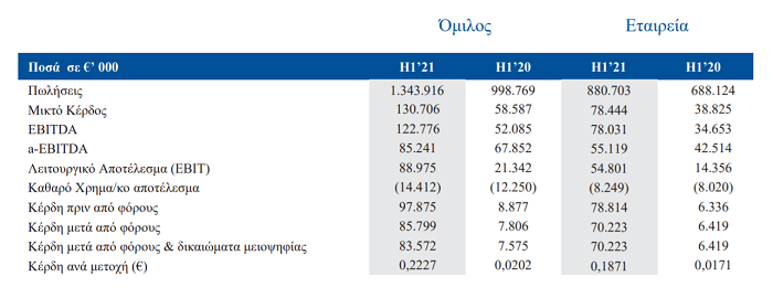 Η αισιοδοξία στις αγορές και η υψηλή ζήτηση, οδήγησαν σε ραγδαία άνοδο τις τιμές των μετάλλων στο LME, με τη μέση τιμή του χαλκού να διαμορφώνεται σε 7.544 ευρώ ανά τόνο (αύξηση 51,2% σε σχέση με το H1’20) και τη μέση τιμή του αλουμινίου να διαμορφώνεται σε 1.864 ευρώ ανά τόνο (αύξηση 28,8% σε σχέση με το Η1΄20). Ο συνδυασμός του ανοδικού όγκου πωλήσεων και των τιμών των μετάλλων διαμόρφωσε τον κύκλο εργασιών στα 1.343,9 εκ. ευρώ για το H1’21, αυξημένο κατά 34,6% από τα 998,8 εκ. ευρώ του H1’20.
