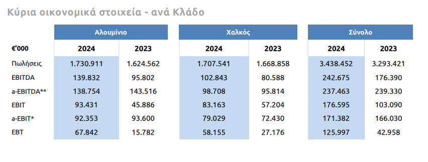 Ο Κλάδος Αλουμινίου κατάφερε να επιτύχει αύξηση του όγκου πωλήσεων του μέσα σε ένα δυσμενές οικονομικό περιβάλλον, παρά τις δύσκολες γεωπολιτικές και οικονομικές συνθήκες, επιβεβαιώνοντας την ανοδική του πορεία για ένα ακόμη έτος. Η αυξημένη ζήτηση για τα προϊόντα της εύκαμπτης συσκευασίας του Κλάδου, ιδιαίτερα μετά το αναιμικό πρώτο τρίμηνο του 2024, σε συνδυασμό με την αυξημένη παραγωγική δυναμικότητα του Τομέα Έλασης Αλουμινίου, συντέλεσαν στην αύξηση του όγκου πωλήσεων κατά 7,3% (ή κατά 7,9% εξαιρώντας το αποτέλεσμα της απο-ενοποίησης της ΕΤΕΜ). Πιο συγκεκριμένα τα προϊόντα που απευθύνονται στην άκαμπτη και εύκαμπτη συσκευασία παρουσίασαν αύξηση 12,9% ενώ τα προϊόντα που απευθύνονται στον κλάδο των κατασκευών σημείωσαν αύξηση κατά 6,4%. Η οργανική κερδοφορία του Κλάδου (a-Ebitda) παρουσίασε μείωση κατά 3,3% στα 138,8 εκατ. ευρώ το 2024 έναντι 143,5 εκατ. ευρώ την αντίστοιχη χρήση του 2023 αποδιδόμενο στις χαμηλές τιμές κατεργασίας και το μίγμα πωλήσεων, που μερικώς αντισταθμίστηκαν από χαμηλότερο κόστος παραγωγής. Τα κέρδη προ φόρων και τόκων του Κλάδου ανήλθαν σε 93,4 εκατ. ευρώ, έναντι κερδών 45,8 εκατ. ευρώ το 2023, επηρεαζόμενα κυρίως από τα αποτελέσματα μετάλλου που διαμορφώθηκαν σε ζημία 5,2 εκατ. ευρώ έναντι ζημίας 36,0 εκατ. ευρώ την περσινή χρήση.