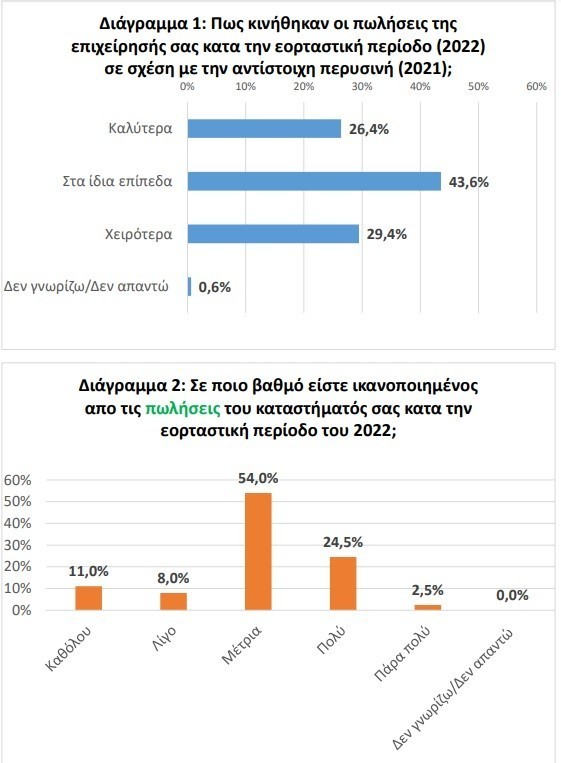 Μία στις τέσσερις επιχειρήσεις (26,4%) σημείωσε υψηλότερες πωλήσεις συγκριτικά με την αντίστοιχη εορταστική περίοδο του 2021- 2 2022, ενώ σχεδόν μία στις δύο (43,6%) επιχειρήσεις δεν κατέγραψε κάποια μεταβολή. Ωστόσο, το 29,4% των επιχειρήσεων εμφάνισε επιδείνωση των πωλήσεων σε σχέση με πέρυσι.
