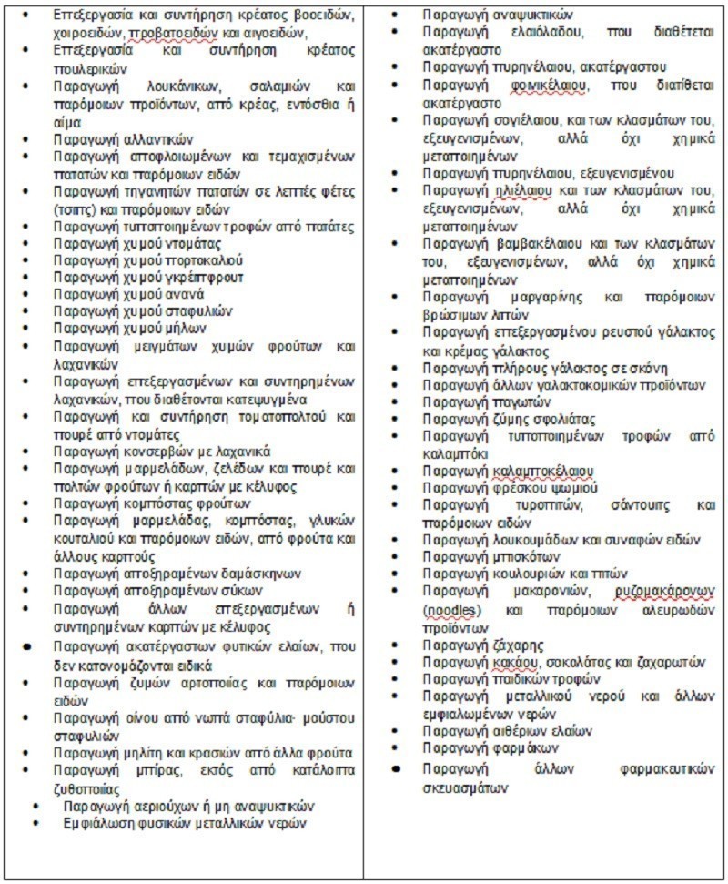 Μπορούν να υπαχθούν επενδυτικά σχέδια του τομέα της μεταποίησης γεωργικών προϊόντων σε δραστηριότητες όπως οι παρακάτω:
