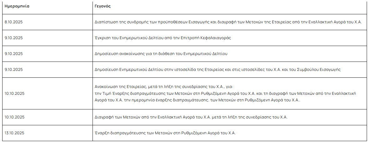 H διαγραφή των μετοχών της Εταιρείας από την Εναλλακτική Αγορά του Χ.A θα πραγματοποιηθεί την 10.09.2025 μετά την λήξη της συνεδρίασης του Χ.Α., και η έναρξη διαπραγμάτευσης των μετοχών της Εταιρείας στη Ρυθμιζόμενη Αγορά του Χ.Α. θα πραγματοποιηθεί την 13.10.2025.