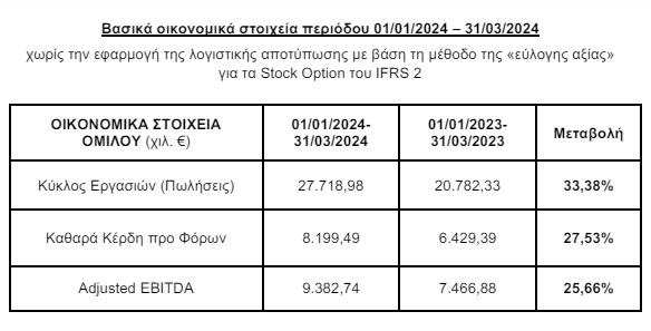 Σημειώνεται ότι, τα οικονομικά μεγέθη του Ομίλου της 31/03/2024 έχουν επιβαρυνθεί από την επιμέτρηση σε εύλογη αξία των δικαιωμάτων προαίρεσης αγοράς μετοχών βάσει του IFRS 2 με το ποσό των 0,30 εκ. ευρώ. Το αντίστοιχο ποσό που επιβάρυνε τα οικονομικά μεγέθη του Ομίλου της 31/03/2023 ανέρχεται στα 0,90 εκ. ευρώ.