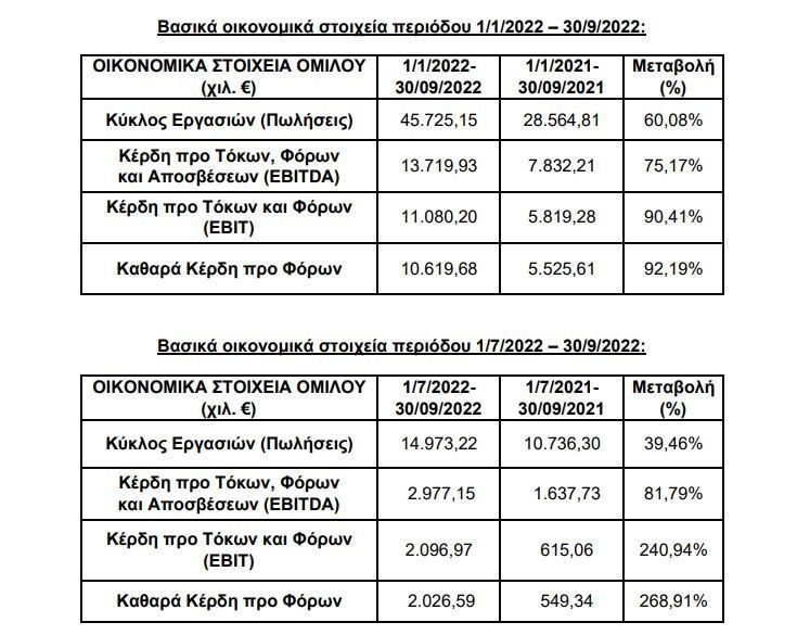 Τέλος η διοίκηση του Ομίλου, μετά και την σημαντική αύξηση (παρά τις δύσκολες συνθήκες που έχουν δημιουργηθεί στην ευρωπαϊκή και ελληνική οικονομία) των χρηματοοικονομικών μεγεθών του εννεάμηνου, επιβεβαιώνει με έμφαση την εκτίμηση της για αύξηση κατά +50% των ετήσιων εσόδων του Ομίλου για το 2022 έναντι του 2021 και επίτευξη περιθωρίου EBITDA σε ετήσια βάση, υψηλότερο του 30%. Παράλληλα και με βάση την συνεπή εκτέλεση του επιχειρηματικού σχεδίου για το 2022 και την στρατηγική συνεργασία με την ΕΘΝΙΚΗ ΤΡΑΠΕΖΑ η διοίκηση του Ομίλου εκτιμά ότι τέθηκαν οι βάσεις για τον αναλυτικό σχεδιασμό του νέου αναπτυξιακού κύκλου στην Ελλάδα και στο εξωτερικό για το 2023- 2025.