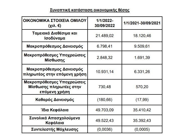 κατά το εννεάμηνο του 2022 ενισχύθηκαν σημαντικά και τα Ίδια Κεφάλαια του Ομίλου (+40%) τα οποία ανήλθαν σε 49,70 εκατ. ευρώ.