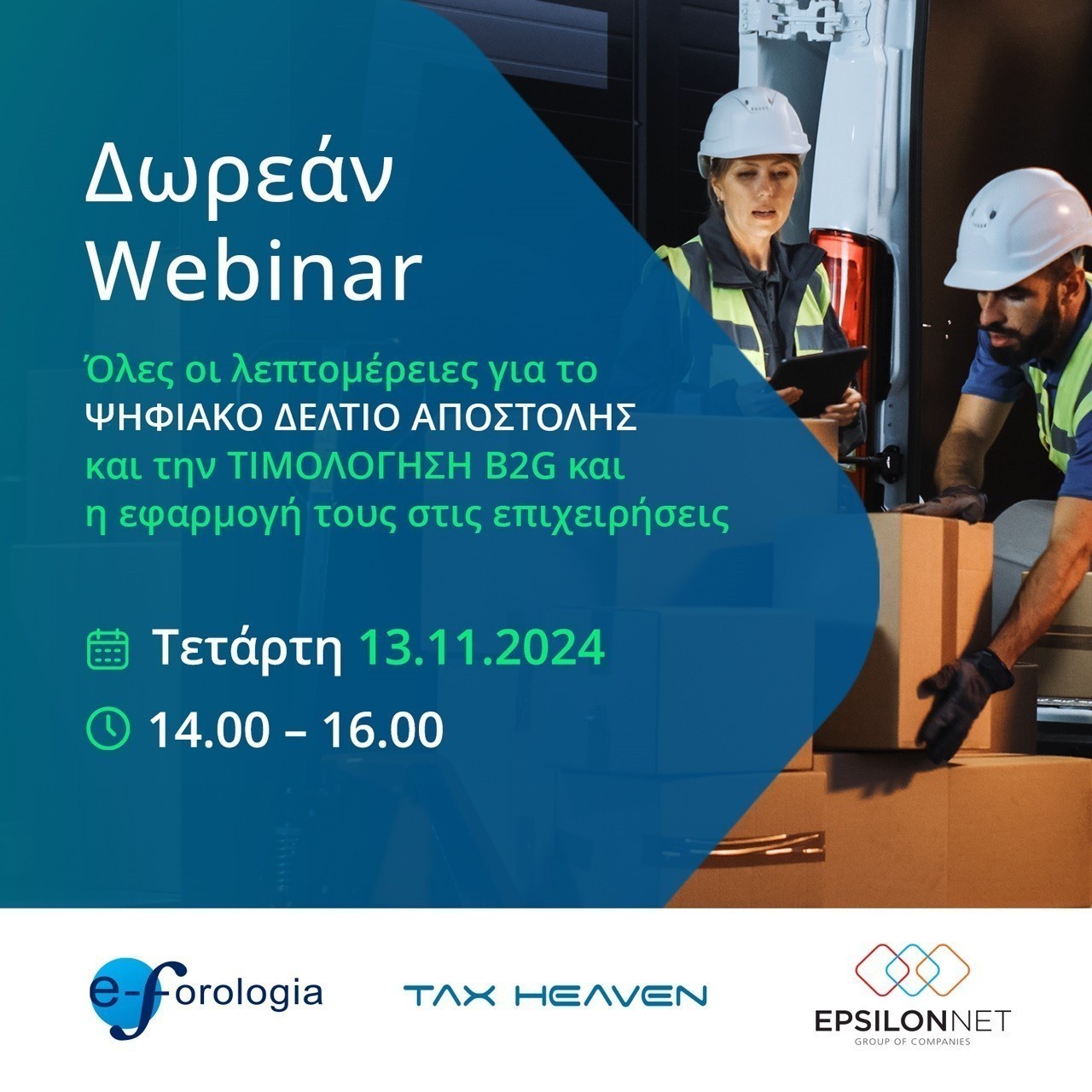 Τέλος, ο Όμιλος EPSILON NET διοργανώνει ενημερωτική ημερίδα την 13 Νοεμβρίου 2024, με την υποστήριξη της Επιστημονικής Ομάδας του e-forologia.gr & taxheaven.gr, με στόχο την έγκαιρη και έγκυρη ενημέρωση όλων των επιχειρήσεων. Συγκεκριμένα στην ειδική ημερίδα θα παρουσιαστούν διαδικασίες, που αναφέρει και ζητά η ανακοίνωση της ΑΑΔΕ, όσον αφορά το Ψηφιακό Δελτίο Αποστολής, καθώς και ο τρόπος παρακολούθησής τους από τις εφαρμογές του Ομίλου EPSILON NET. Για περισσότερες πληροφορίες δείτε εδώ .