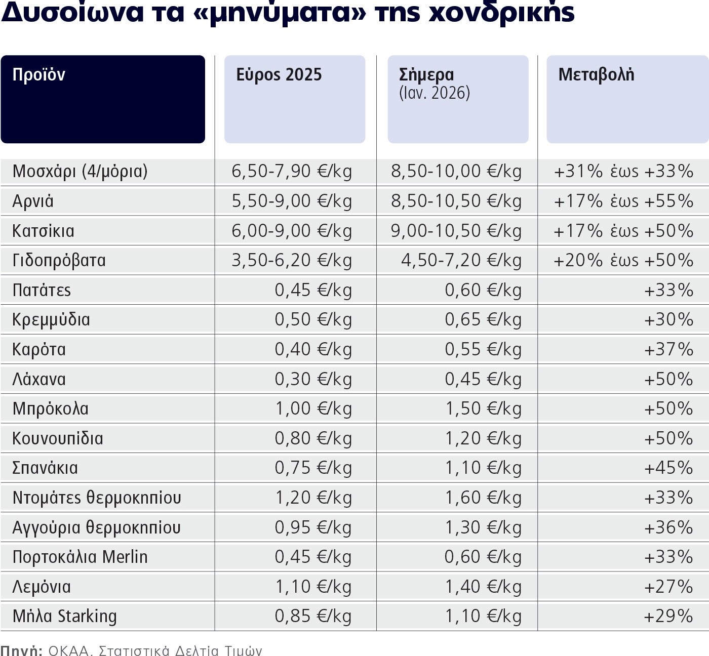 ■ Οι εγχώριες πατάτες διαπραγματεύονται σήμερα γύρω στα 0,60 ευρώ το κιλό, από περίπου 0,45 ευρώ πέρυσι, καταγράφοντας άνοδο της τάξης του 33%. Τα ξερά κρεμμύδια κινούνται στα 0,65 ευρώ, από 0,50 ευρώ το 2025 (+30%), ενώ τα καρότα βρίσκονται στα 0,55 ευρώ έναντι 0,40 ευρώ πέρυσι (+37%). Ακόμη πιο έντονη είναι η εικόνα στα «βαριά» χειμερινά λαχανικά: τα άσπρα λάχανα έχουν ανέβει στα 0,45 ευρώ από 0,30 ευρώ (+50%), τα μπρόκολα στο 1,50 ευρώ από 1,00 ευρώ (+50%), τα κουνουπίδια στο 1,20 ευρώ από 0,80 ευρώ (+50%), ενώ τα σπανάκια διαπραγματεύονται πλέον στο 1,10 ευρώ από 0,75 ευρώ (+45%).