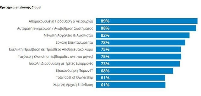 Οι άλλοι λόγοι υιοθέτησης του Cloud είναι η ευκολία στην επεκτασιμότητα (78%), η ευελιξία και η εύκολη πρόσβαση σε επιπλέον αποθηκευτικό χώρο (75%), η ταχύτητα υλοποίησης (75%), που πλέον μετριέται σε μέρες ή εβδομάδες και όχι μήνες και η ευκολία διασύνδεσης με εφαρμογές τρίτων (73%).