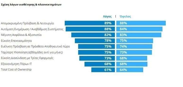Η έρευνα δείχνει την ταύτιση ανάμεσα στα πραγματικά, μετρήσιμα οφέλη, που οι ίδιες επιχειρήσεις κατάφεραν να αποκομίσουν με τη χρήση του Cloud και στους λόγους που τις οδήγησαν στην υιοθέτησή τους. Για παράδειγμα, το 88% δηλώνει πως πράγματι βιώνει το όφελος της απομακρυσμένης λειτουργίας και πρόσβασης, το 74% την ευελιξία και την πρόσβαση σε επιπλέον αποθηκευτικό χώρο, το 64% καλύτερο Τotal Cost of Ownership.