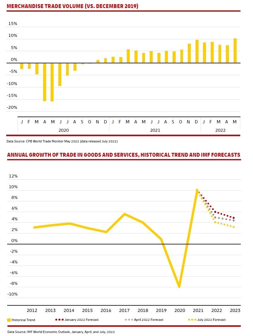 Το εντυπωσιακό δε είναι πως η τάση ενίσχυσης του παγκόσμιου εμπορίου δεν κάμπτεται και απ’ τον πόλεμο στην Ουκρανία και την επιβολή των δυτικών κυρώσεων στη Ρωσία, αν και ομολογουμένως έχουν κατεβάσει τον πήχη των προσδοκιών για την ανάπτυξη του διεθνούς εμπορίου για φέτος. Παρ’ όλα αυτά, σύμφωνα με την έρευνα, ο ρυθμός ανάπτυξης του παγκόσμιου εμπορίου φέτος και το 2023 θα ξεπεράσει το μέσο ρυθμό ανάπτυξης της προηγούμενης δεκαετίας!