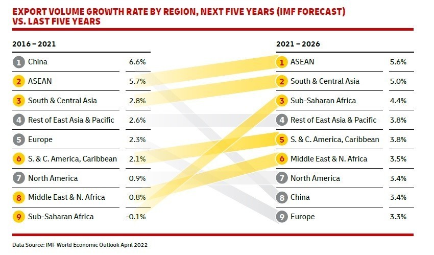 Η έρευνα επίσης καταρρίπτει και το σενάριο ότι κερδίζει δυναμική στο παγκόσμιο εμπόριο η τάση συρρίκνωσης των αποστάσεων της εφοδιαστικής αλυσίδας. Το αντίθετο μάλιστα, λόγω των πληθωριστικών πιέσεων και της μείωσης του μεταφορικού κόστους κατά τους τελευταίους μήνες φαίνεται ότι οι ασιατικές οικονομίες εδραιώνουν ακόμα πιο ισχυρό ρόλο στο παγκόσμιο εμπόριο. Μάλιστα εκτίμηση της φετινής έρευνας είναι κατά την επόμενη πενταετία θα δημιουργηθούν νέοι πόλοι στην Νότια και ΝΑ Ασία με το Βιετνάμ, την Ινδία και τις Φιλιππίνες να πρωταγωνιστούν. Παράλληλα προβλέπεται να επιταχυνθεί σημαντικά η ανάπτυξη στην Υποσαχάρια Αφρική. Σε κάθε περίπτωση πάντως σε επίπεδο όγκου η Κίνα θα διατηρήσει τα πρωτεία την επόμενη πενταετία. ΗΠΑ και Γερμανία θα ακολουθήσουν στις επόμενες δύο θέσεις. Από εκεί και έπειτα θα είναι η Ολλανδία, η Ινδία, το Χονγκ Κονγκ, η Ιταλία, η Ν. Κορέα και η Σιγκαπούρη.
