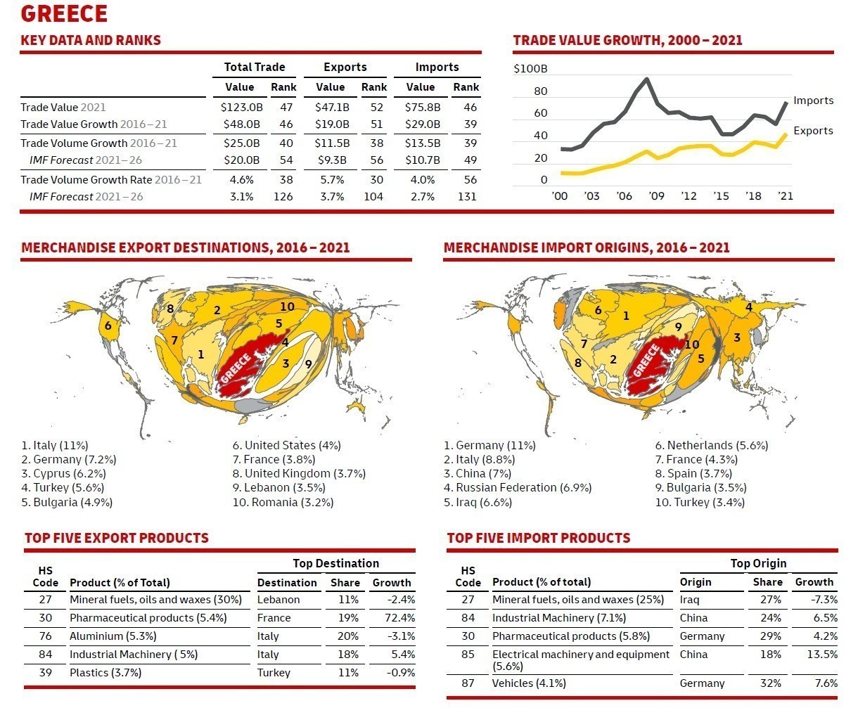 Αν και η έρευνα δεν κάνει ξεχωριστή αναφορά για την Ελλάδα, εν τούτοις χρησιμοποιεί τις παραδοχές της τελευταίας έκθεσης του ΔΝΤ, σύμφωνα με την οποία η χώρα μας παρά τη σημαντική ενίσχυση της εξωστρέφειας της τα τελευταία χρόνια, θα ρίξει τους ρυθμούς ανάπτυξης του διασυνοριακού εμπορίου. Συγκεκριμένα απ’ το 5%, που είχε καταγράψει κατά μ.ο. την πενταετία 2016 – 2021 και που την κατέττασε στην 38η θέση διεθνώς, θα έχει μέσο ετήσιο ρυθμό ανάπτυξης 3% την πενταετία ως το 2026. Κάτι που σημαίνει πως θα έχει την 126η θέση στην παγκόσμια κατάταξη της ενίσχυσης του διασυνοριακού εμπορίου.