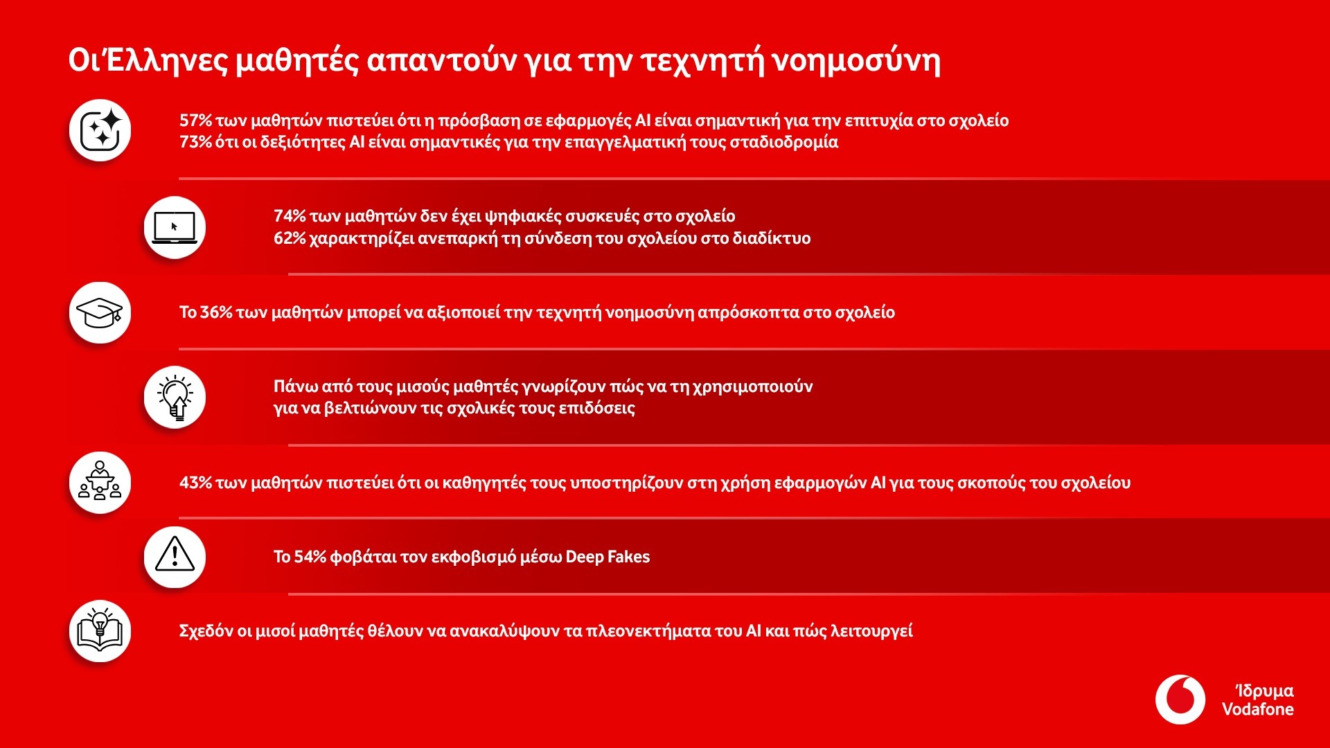 Σύμφωνα με έρευνα της εταιρείας μελετών Ipsos για το Ίδρυμα Vodafone, σε συνολικά επτά ευρωπαϊκές χώρες, συμπεριλαμβανομένης της Ελλάδας, οι μαθητές στη χώρα μας είναι από τους πλέον πρόθυμους στην Ευρώπη να εξερευνήσουν τις δυνατότητες της τεχνητής νοημοσύνης και επιθυμούν την ενσωμάτωσή της στην εκπαιδευτική διαδικασία.