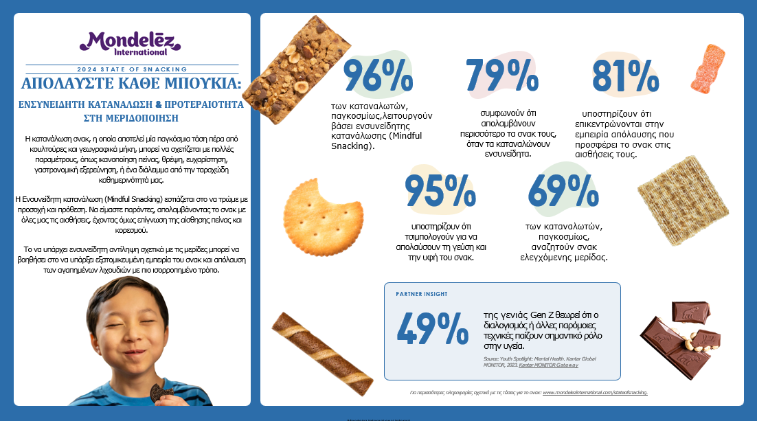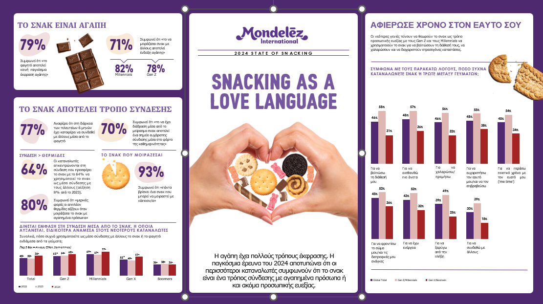 Για 6η συνεχή χρονιά, η Mondelēz International παρουσίασε τα αποτελέσματα της έκθεσης State of Snacking™, η οποία πραγματοποιείται σε συνεργασία με την Harris Poll σε 12 χώρες και μελετά τάσεις και συμπεριφορές χιλιάδων καταναλωτών σχετικά με το σνακ.