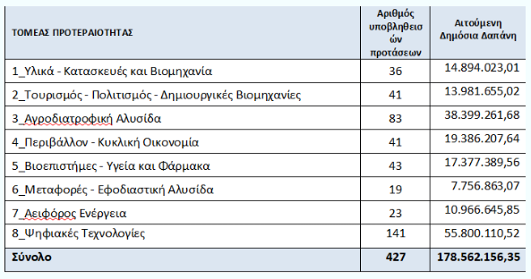 Υποβλήθηκαν 427 προτάσεις με Δημόσια Δαπάνη 178.562.156,35€ και Προϋπολογισμό 237.367.328,14€. Η διαδικασία αξιολόγησης θα ξεκινήσει στο αμέσως επόμενο διάστημα.