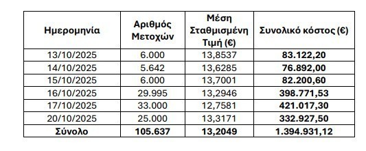 Η Εθνική Τράπεζα της Ελλάδος Α.Ε., σε συνέχεια των αποφάσεων της από 30/05/2025 Τακτικής Γενικής Συνέλευσης των Μετόχων της και της από 04/06/2025 ανακοίνωσής της αναφορικά με την έναρξη υλοποίησης του πρώτου σκέλους του προγράμματος αγοράς ιδίων μετοχών που εγκρίθηκε από την ως άνω Γενική Συνέλευση (Σκέλος I), και κατόπιν της από 28/05/2025 σχετικής έγκρισης του Ενιαίου Εποπτικού Μηχανισμού (EEM) της Ευρωπαϊκής Κεντρικής Τράπεζας (ΕΚΤ) και των από 16/06/2025, 26/06/2025, 04/07/2025, 14/07/2025, 21/07/2025, 29/07/2025, 07/08/2025, 18/08/2025, 26/08/2025, 02/09/2025, 09/09/2025, 17/09/2025, 26/09/2025, 06/10/2025 και 13/10/2025 ανακοινώσεών της σχετικά με την αγορά ιδίων μετοχών, ανακοινώνει ότι κατά την περίοδο από 13/10/2025 έως και 20/10/2025 απέκτησε συνολικά 105.637 κοινές μετοχές της Τράπεζας που διαπραγματεύονται στο Χρηματιστήριο Αθηνών με μέση σταθμισμένη τιμή €13,2049 ανά μετοχή και με συνολικό κόστος €1.394.931,12.