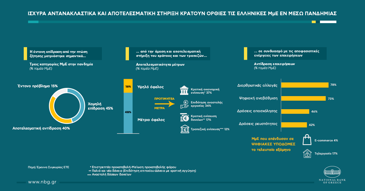 Η ταχύτατη εξάπλωση της πανδημίας εύλογα έπληξε έντονα τη δραστηριότητα των ελληνικών ΜμΕ, ωστόσο ως αξιοσημείωτο στοιχείο της συγκυρίας ξεχωρίζει η αποτελεσματικότητα της αντίδρασης του τρίπτυχου επιχειρήσεις-κράτος-τράπεζες για τον ουσιαστικό περιορισμό των συνεπειών της πρωτοφανούς αυτής κρίσης.