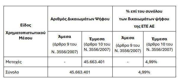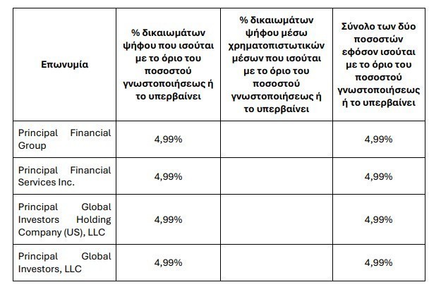Η Εθνική Τράπεζα της Ελλάδος A.E. ανακοίνωσε ότι σε συνέχεια σχετικής γνωστοποίησης σημαντικών αλλαγών στα δικαιώματα ψήφου της Τράπεζας από την “Principal Global Investors, LLC” σύμφωνα με τον Ν. 3556/2007, καθώς και της από 16.10.2025 γνωστοποίησης που έλαβε η Τράπεζα από την “Principal Financial Group”, υπό την ιδιότητά της ως τελική μητρική εταιρεία της “Principal Global Investors, LLC”, η Τράπεζα γνωστοποιεί με την παρούσα, ότι το συνολικό ποσοστό δικαιωμάτων ψήφου τα οποία αντιστοιχούν σε ισάριθμες κοινές, ονομαστικές, μετά ψήφου, άυλες μετοχές που κατέχει έμμεσα η “Principal Financial Group”, από την ημερομηνία που αυτά περιήλθαν στην κατοχή της “Principal Global Investors, LLC”, κατήλθε στις 13.10.2025 του ελάχιστου ορίου του 5% επί του συνόλου των δικαιωμάτων ψήφου της Τράπεζας.