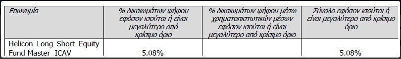 2. Σύμφωνα με τα προβλεπόμενα στο άρθρο 7α (παρ. 6 περ. γ) του ν. 3864/2010, με βάση τη σχετική ενημέρωση που έλαβε η Εταιρεία από την Helicon, υπερέβη στις 27.01.2021 του ορίου του 5% επί του συνολικού αριθμού των δικαιωμάτων ψήφου της Εταιρείας, εξαιρουμένων των δικαιωμάτων ψήφου του ΤΧΣ, καθώς το ποσοστό δικαιωμάτων ψήφου της Helicon στο μετοχικό κεφάλαιο της Εταιρείας διαμορφώθηκε σε 5,08%, ποσοστό που αντιστοιχεί σε 185.951.550 δικαιώματα ψήφου επί μετοχών της Εταιρείας.