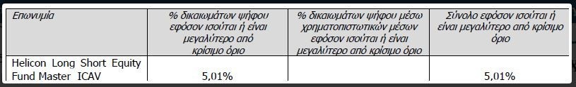 Σύμφωνα με σχετική ενημέρωση που έλαβε η εταιρεία από την Helicon, το ποσοστό δικαιωμάτων ψήφου της τελευταίας στο μετοχικό κεφάλαιο της εταιρείας διαμορφώθηκε σε 5,08%, ποσοστό που αντιστοιχεί σε 185.951.550 δικαιώματα ψήφου επί μετοχών της εταιρείας.