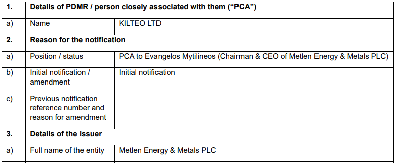 Η Metlen Energy & Metals PLC ανακοίνωσε ότι η Kilteo Ltd, εταιρεία που συνδέεται με τον πρόεδρο και διευθύνοντα σύμβουλο Ευάγγελο Μυτιληναίο, απέκτησε 6.000 μετοχές της Metlen στην τιμή των 40,7824 ευρώ ανά μετοχή.
