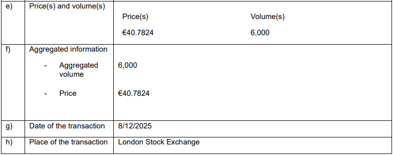 Η αγορά, συνολικής αξίας περίπου 245 χιλιάδων ευρώ, πραγματοποιήθηκε στις 8 Δεκεμβρίου μέσω του χρηματιστηρίου του Λονδίνου (LSE), σύμφωνα με τις απαιτήσεις γνωστοποίησης του ευρωπαϊκού και βρετανικού κανονιστικού πλαισίου.