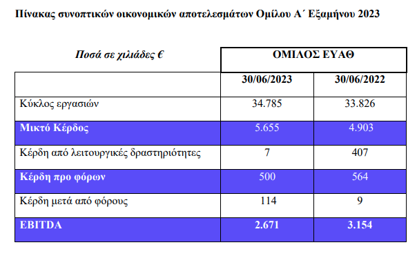 Αύξηση του κύκλου εργασιών και των χρηματοοικονομικών εσόδων κατά €1,4 εκατ. συγκριτικά με το Α΄ εξάμηνο 2022, επενδύσεις περιόδου 1/1/23 – 30/6/23 στα €6 εκατ, συγκράτηση του κόστους ενέργειας στα €11,8 εκατ και συνολικά του κόστους πωληθέντων στα €39 εκατ και θετικό αποτέλεσμα έναντι των ζημιών της προηγούμενης χρήσης, παρουσιάζουν οι οικονομικές καταστάσεις της ΕΥΑΘ για το α’ εξάμηνο του 2023.