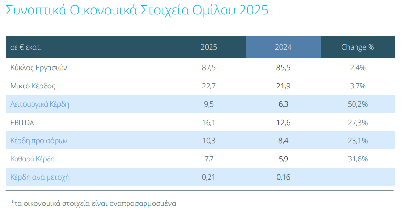 Καθαρά κέρδη €7,7 εκατ.,+31,6% σημειώνοντας ισχυρή αύξηση σε σχέση με το προηγούμενο έτος με το περιθώριο κερδοφορίας στα 8,8%. (6,9% το 2024)