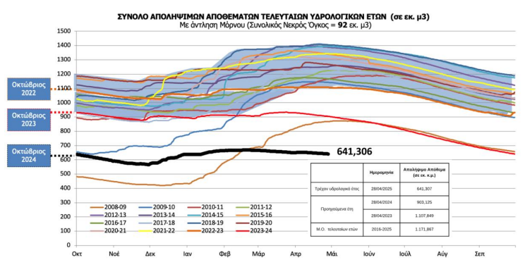 Εάν συνεχιστούν οι ίδιες κλιματικές και υδρολογικές συνθήκες της προηγούμενης τριετίας και το Δημόσιο σε συνεργασία με την ΕΥΔΑΠ δεν προχωρήσει στις απαραίτητες δράσεις και ενέργειες τεκμαίρεται ότι τα αποθέματα στους ταμιευτήρες που υδροδοτούν την Αττική θα διαρκέσουν έως το τέλος της υδρολογικής περιόδου 2026-2027. Στο παρακάτω διάγραμμα απεικονίζεται διαχρονικά και κατά υδρολογικό έτος, το σύνολο των αποθεμάτων στους ταμιευτήρες της ΕΥΔΑΠ ΠΑΓΙΩΝ, η οποία προμηθεύει με νερό την ΕΥΔΑΠ.