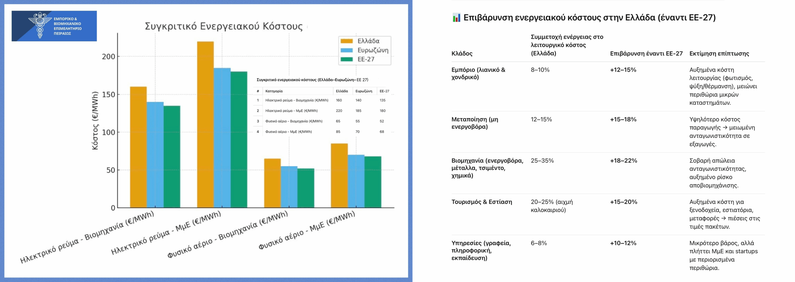 Σύμφωνα με την Eurostat, το ενεργειακό κόστος των ελληνικών ΜμΕ είναι 15-20% υψηλότερο από τον μ.ο. της ΕΕ, μειώνοντας την ανταγωνιστικότητα των ελληνικών προϊόντων στις εξαγωγές. Επίσης, σύμφωνα με την ΤτΕ, το υψηλό ενεργειακό κόστος μετακυλίεται στις τελικές τιμές αγαθών και, μάλιστα, το 1/3 της αύξησης των τιμών τροφίμων έχει προκληθεί από τα ενεργειακά κόστη. Ανά κλάδο, το μερίδιο του ενεργειακού κόστους στο συνολικό λειτουργικό κόστος, καθώς η επιβάρυνση των ελληνικών επιχειρήσεων έναντι των χωρών της ΕΕ-27 έχουν μεγάλη απόκλιση. Συγκεκριμένα, στο λειτουργικό κόστος του εμπορίου το ενεργειακό μερίδιο κυμαίνεται 8-10% και επιβαρύνεται με επιπλέον +10-12%, στη μεταποίηση 12-15% και +15-18%, στην ενεργοβόρα βιομηχανία 25-35% και +18-22%, στον τουρισμό και στην εστίαση 20-25% και +15-20% και, τέλος, στις υπηρεσίες 6-8% και +10-12%, αντίστοιχα.