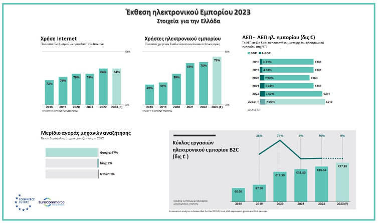 Ο Πρόεδρος του Ε.Β.Ε.Π. και μέλος της EuroCommerce, Bασίλης Κορκίδης, αναφέρθηκε στα στοιχεία για την Ελλάδα: «Τόσο το 2022 όσο και 2023, χαρακτηρίζονται από ένα επίμονο υψηλό πληθωρισμό, με αποτέλεσμα οι ευρωπαίοι και οι εγχώριοι καταναλωτές να είναι πολύ πιο ευάλωτοι στις τιμές βασικών αγαθών. Σύμφωνα με τον πίνακα της έρευνας (βλ. συνημμένο) και τα στοιχεία της Eurostat για την χώρα μας είναι εμφανές πως η χρήση του internet από το 79% του 2021 ενισχύθηκε σε 84% τη διετία 2022 και 2023. Από τις πιο δημοφιλείς μηχανές αναζήτησης με συντριπτικό μερίδιο 97% στην Ελλάδα ήταν η Google. Αντίστοιχα οι Έλληνες διαδικτυακοί καταναλωτές συνεχίζουν να αυξάνονται από το 51% το 2019 στο 70% το 2022 και στο 75% το 2023. Οι διαδικτυακές πωλήσεις B2C συνεχίσουν να αυξάνονται διαρκώς από τα 7,5 δις ευρώ το 2019, κατά 8-10% ετησίως, με εκτιμώμενο κύκλο εργασιών 17,33 δις ευρώ το 2023. Το ηλεκτρονικό εμπόριο, σύμφωνα με τα στοιχεία του ΔΝΤ για το E-GDP, ακολουθεί με ποσοστό συμμετοχής 7,9% την αύξηση του ΑΕΠ στην Ελλάδα. Οι καταναλωτικές συνήθειες αλλάζουν γρήγορα και η ελληνική επιχειρηματικότητα φαίνεται να προσαρμόζεται».