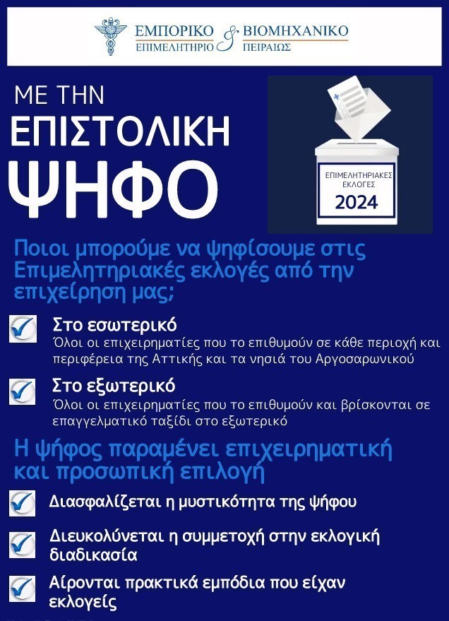 «Η ελληνική κυβέρνηση φρόντισε, αρχής γενομένης από τις ευρωεκλογές του Ιουνίου, να άρει τα πρακτικά εμπόδια που είχαν οι εκλογείς εντός και εκτός Ελλάδος. Το ΕΒΕΠ ζητά, λοιπόν, από τον πρωθυπουργό και τα αρμόδια υπουργεία να πράξουν το ίδιο στις επιμελητηριακές εκλογές του 2024, δίνοντας τη δυνατότητα της επιχειρηματικής και προσωπικής επιλογής με την αξιοποίηση του νόμου της επιστολικής ψήφου» καταλήγει η επιστολή.