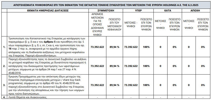 Πιο αναλυτικά, η «ΕΥΡΩΠΗ HOLDINGS ΑΝΩΝΥΜΗ ΕΤΑΙΡΕΙΑ» (Δ.Τ. «ΕΥΡΩΠΗ HOLDINGS Α.Ε.»), εφεξής «η Εταιρεία», ανακοινώνει ότι την 6η Μαρτίου 2025, ημέρα Πέμπτη και ώρα δωδεκάτη μεσημβρινή (12:00 μ.μ.), πραγματοποιήθηκε η συνεδρίαση της Έκτακτης Γενικής Συνέλευσης των Μετόχων της Εταιρείας με φυσική παρουσία, στην οποία συμμετείχαν αυτοπροσώπως ή δια αντιπροσώπου ένδεκα (11) μέτοχοι, εκπροσωπούντες 73.392.622 κοινές, ονομαστικές, μετά δικαιώματος ψήφου μετοχές επί συνόλου 86.403.698 κοινών, ονομαστικών, μετά δικαιώματος ψήφου μετοχών δηλαδή ποσοστό 89,94% επί του συνολικά καταβεβλημένου μετοχικού κεφαλαίου της Εταιρείας, συγκεντρώνοντας την απαιτούμενη εκ του νόμου απαρτία για όλα τα θέματα της Ημερησίας Διατάξεως.