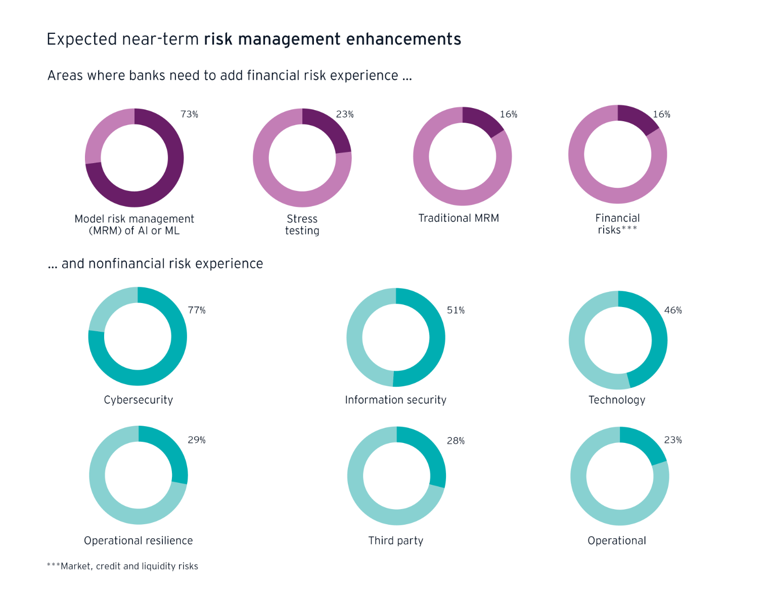 Οι επαγγελματίες σε θέματα διαχείρισης κινδύνου, οι ρυθμιστικές αρχές, καθώς και οι υπεύθυνοι για τη χάραξη πολιτικής, επικεντρώνονται ιδιαίτερα στους κινδύνους που σχετίζονται με την αυξημένη χρήση τεχνολογιών τεχνητής νοημοσύνης και μηχανικής μάθησης. Οι ομάδες κινδύνου των τραπεζών αντιμετωπίζουν ήδη προκλήσεις όσον αφορά την κατανόηση των νέων κινδύνων (64%) και την απόκτηση του κατάλληλου ανθρώπινου δυναμικού για τη διαχείρισή τους (59%). Διαπιστώνουν, επίσης, ως πρόσθετες προκλήσεις, την έλλειψη ιστορικών δεδομένων σχετικά με τη λειτουργία των μοντέλων αυτών υπό διαφορετικές συνθήκες αγοράς (54%), καθώς και τις αβέβαιες ρυθμιστικές προσδοκίες (47%).