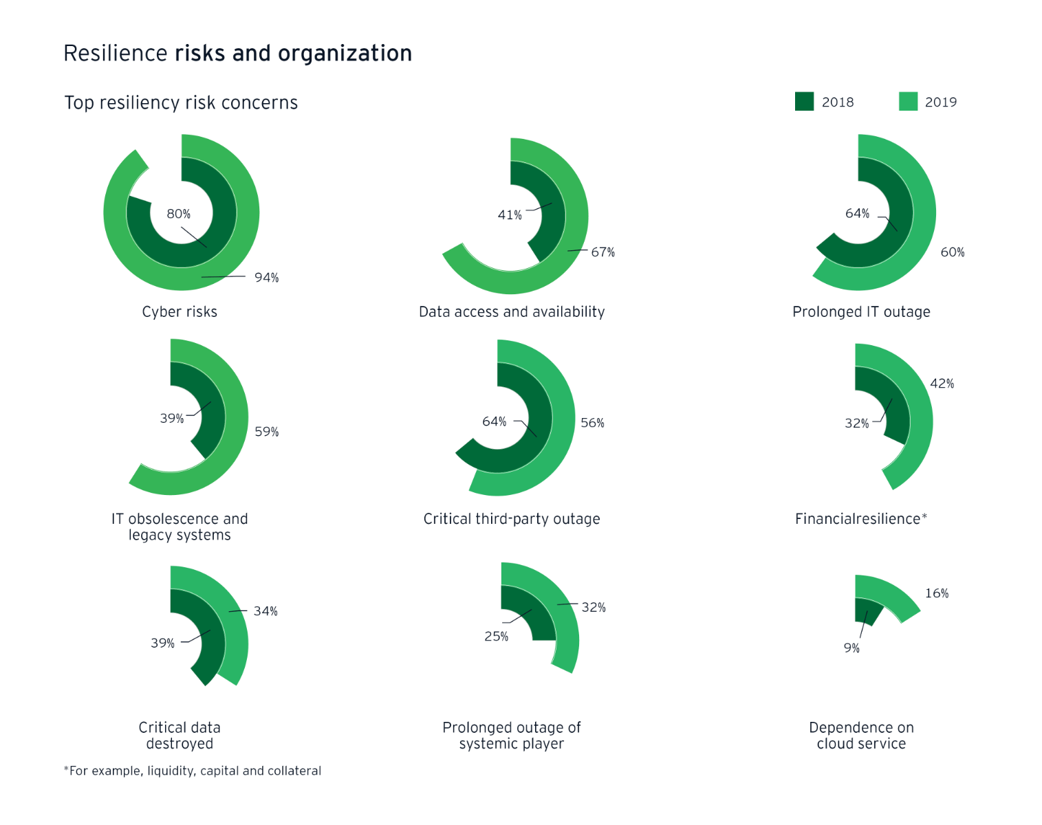 Σε γενικές γραμμές, οι επαγγελματίες σε θέματα διαχείρισης κινδύνου ανησυχούν για την προσαρμογή της διαχείρισης κινδύνου (60%) και της εταιρικής κουλτούρας (58%) στα νέα πρότυπα που θα φέρει η μετάβαση του κλάδου στην τεχνολογία cloud.