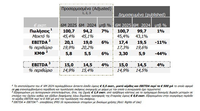Οι δημοσιευμένες πωλήσεις Α΄ εξαμήνου του 2025 ανήλθαν στα € 100,7 εκατ. από € 99,7 εκατ. το αντίστοιχο διάστημα του 2024, παρουσιάζοντας αύξηση κατά 1% περίπου. Εξαιρουμένης της μη επαναλαμβανόμενης πώλησης1, οι συγκρίσιμες πωλήσεις, είναι αυξημένες κατά 7%