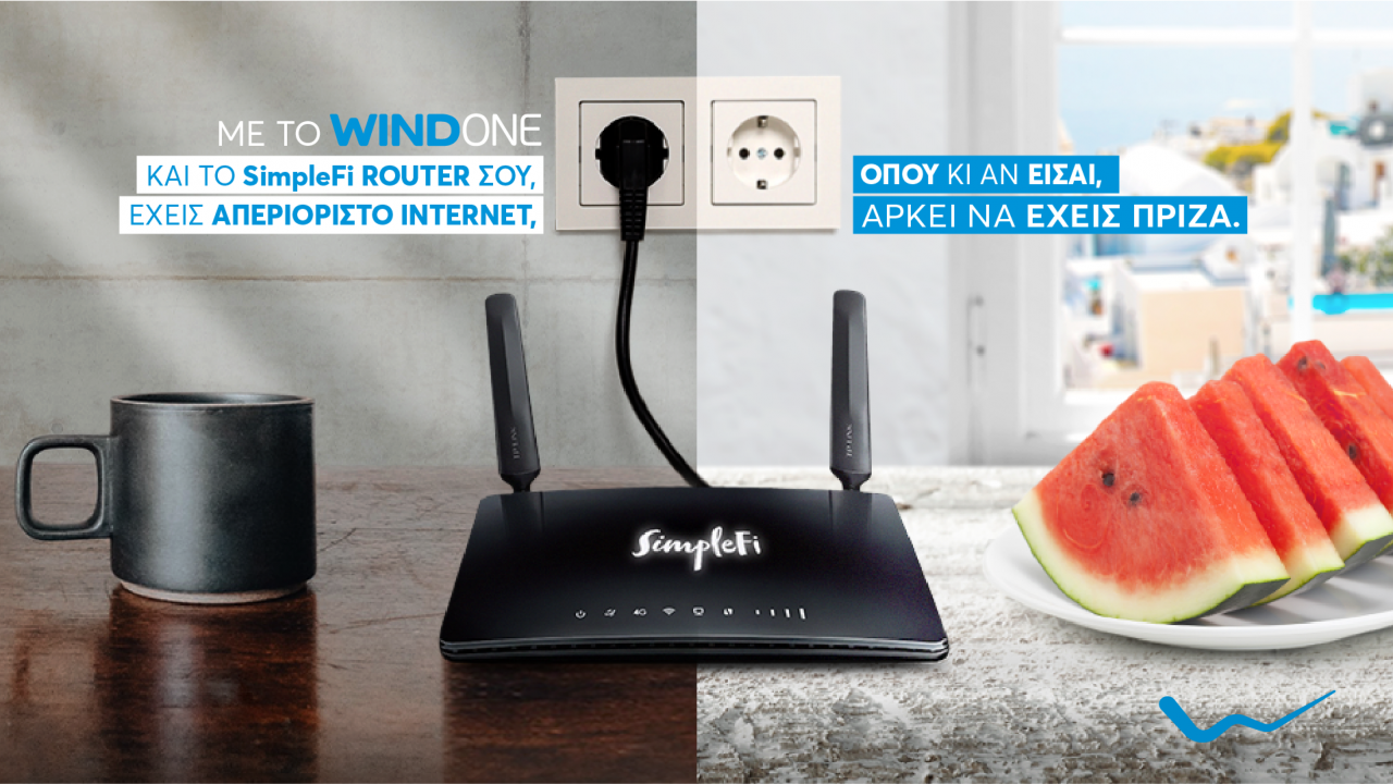 H WIND έχει φέρει μία νέα εποχή χωρίς περιορισμούς στη συνδεσιμότητα. Κατανοεί πλήρως τις απαιτήσεις και τις ανάγκες των συνδρομητών της για επικοινωνία και τους δίνει μεγαλύτερη ελευθερία και δυνατότητες. Ειδικά τώρα το καλοκαίρι, με το ανανεωμένο WIND ONE και το Νέο SimpleFi router οι συνδρομητές της WIND έχουν πραγματικά ΑΠΕΡΙΟΡΙΣΤΟ Internet και υπερ-υψηλές ταχύτητες 4G & 5G, όπου και αν βρίσκονται, στο νησί, το χωριό ή την πόλη, χωρίς ανάγκη σταθερής γραμμής, αρκεί να έχουν πρίζα.