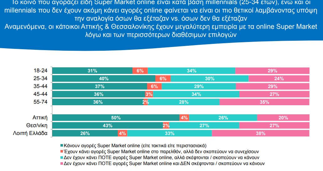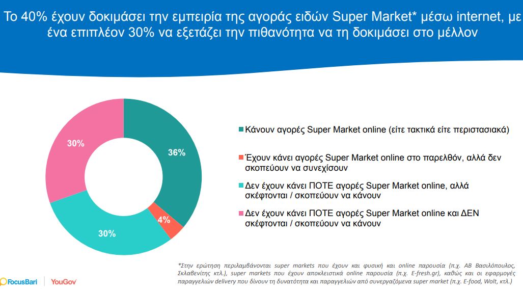 - 4 στους 10 Έλληνες ψώνισαν τουλάχιστον μια φορά είδη σουπερμάρκετ online, επιπλέον 1 στους 3 σκέπτονται να υιοθετήσουν αυτή την συνήθεια στο μέλλον, ενώ…