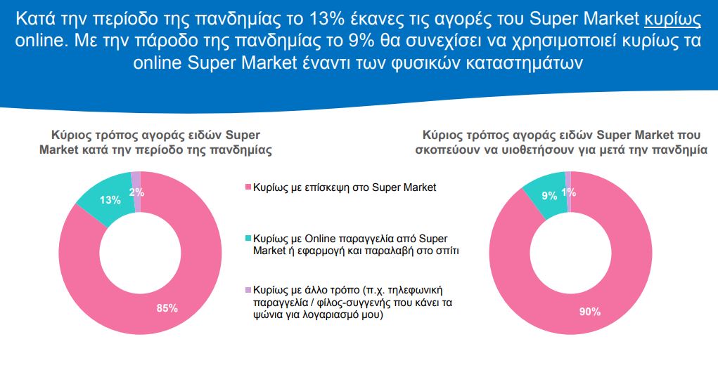 - 13% προτιμούν τo online κανάλι ως το κύριο για τα ψώνια σουπερμάρκετ και 9% δηλώνουν ότι θα έχουν την online εκδοχή ως κύριο κανάλι στο μέλλον.