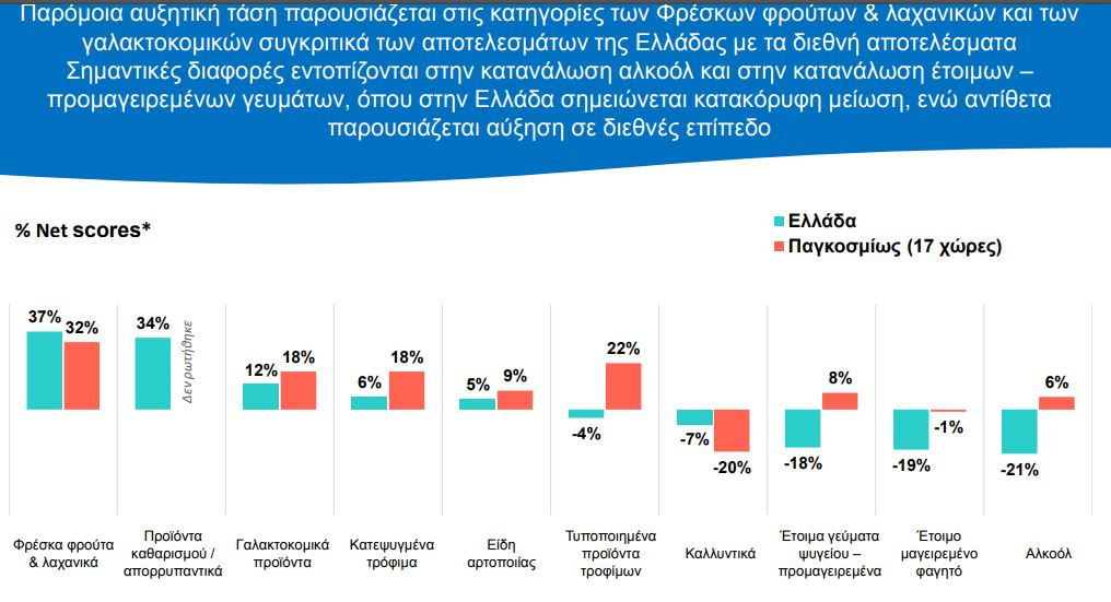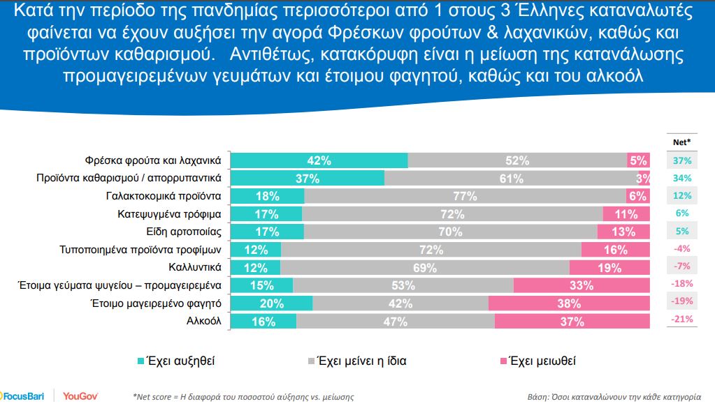 - Κατά την περίοδο της πανδημίας περισσότεροι από 1 στους 3 Έλληνες καταναλωτές φαίνεται να έχουν αυξήσει την αγορά Φρέσκων φρούτων & λαχανικών, και προϊόντων καθαρισμού.