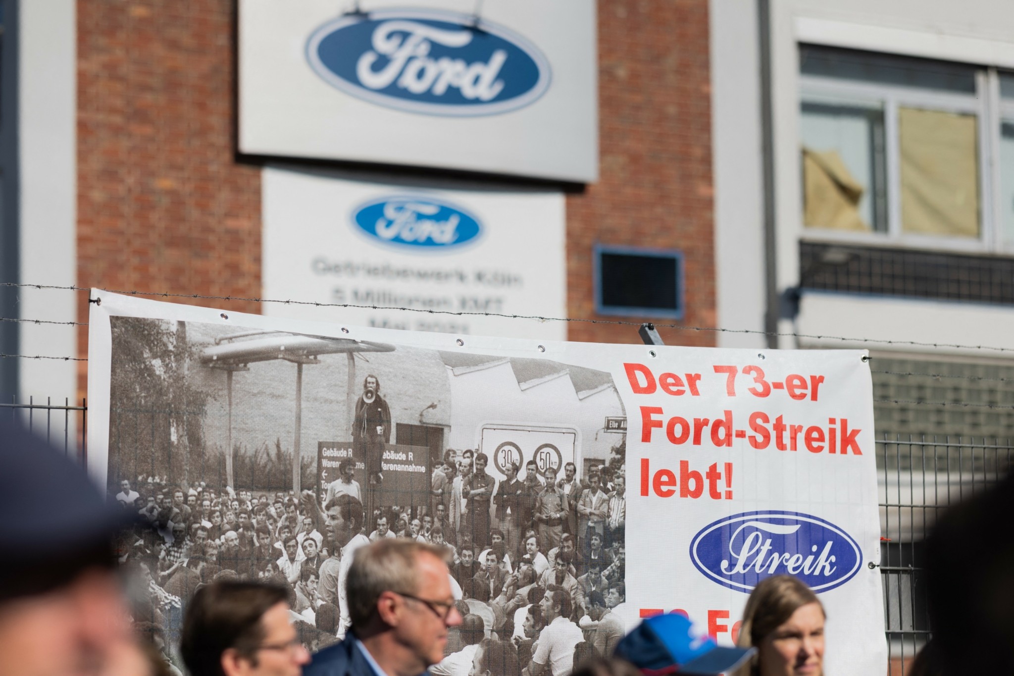 Οι εργαζόμενοι συγκεντρώθηκαν μπροστά από ένα από τα εργοστάσια της Κολωνίας, κρατώντας ψηλά ένα κόκκινο πανό με το σύνθημα «Αγωνίσου για κάθε θέση εργασίας».