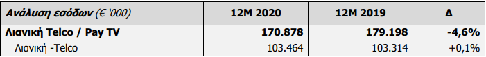 Αύξηση του EBITDA 2020 στα 55,6 εκατ. Ευρώ, σε σχέση με 37,1 εκατ. Ευρώ το 2019. Τα αποτελέσματα επηρεάστηκαν θετικά από έκτακτα κέρδη € 25,3 εκατ. που προέκυψαν από συμφωνίες ρύθμισης υποχρεώσεων προηγουμένων περιόδων της θυγατρικής εταιρείας Forthnet Media A.E..