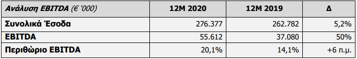 Το EBITDA του 2020 ανήλθε στα €55,6 εκατ., έναντι €37,1 εκατ. του 2019. Η μεταβολή αυτή οφείλεται κυρίως στα κέρδη που προέκυψαν από συμφωνίες με προμηθευτές για ρύθμιση υποχρεώσεων προηγουμένων περιόδων που είχαν συνολική θετική επίδραση €25,3 εκ.