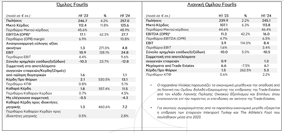- Οι ενοποιημένες πωλήσεις του Ομίλου Fourlis αυξήθηκαν κατά 4,2% φτάνοντας τα €257,0 εκ. το Α’ εξάμηνο του 2024.