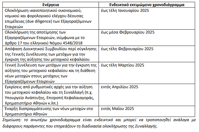 Η Frigoglass Α.Β.Ε.Ε. (η «Εταιρεία»), σε συνέχεια δημοσιευμάτων του ηλεκτρονικού τύπου και σχετικού ερωτήματος της Επιτροπής Κεφαλαιαγοράς, παρέχει αναθεωρημένο ενδεικτικό χρονοδιάγραμμα αναφορικά με την υλοποίηση της ανακοινωθείσας τον Σεπτέμβριο του 2024 σχεδιαζόμενης εξαγοράς (η «Συναλλαγή») των αλλοδαπών εταιρειών Provisiona Iberia, S.L. (η «Provisiona») και Serlusa Refrigerantes, LDA (η «Serlusa Refrigerantes» και μαζί με την Provisiona, οι «Εξαγοραζόμενες Εταιρείες»), η οποία αναμένεται να ολοκληρωθεί εντός του δευτέρου τριμήνου του 2025: